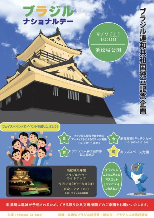 No dia 7 de setembro, o Castelo de Hamamatsu se iluminará com as vibrantes cores verde e amarela da bandeira brasileira, em uma homenagem especial ao Dia da Independência do Brasil. A cerimônia de iluminação, programada para começar às 18:30, para celebrar os fortes laços entre a comunidade brasileira e a população local japonesa em Hamamatsu, que abriga uma das maiores comunidades brasileiras no Japão.
