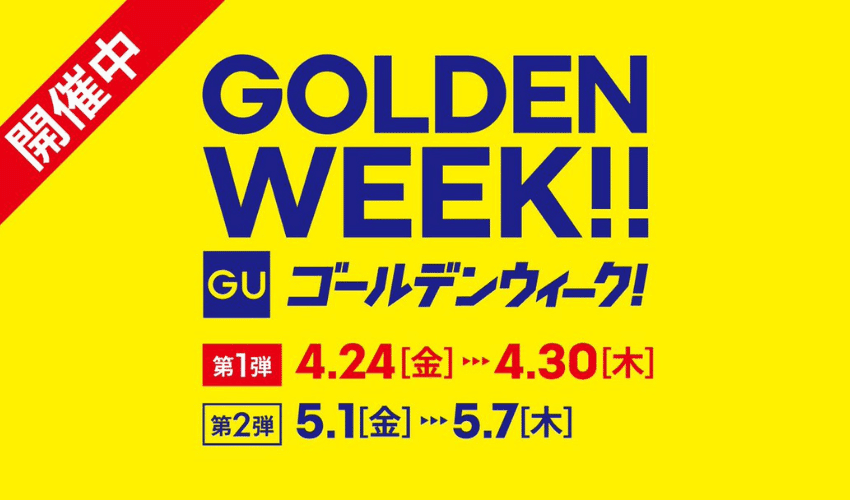 Bright yellow poster advertising GU Golden Week sale, with dates 4.24–4.30 and 5.1–5.7; red diagonal '開催中' banner in the corner.