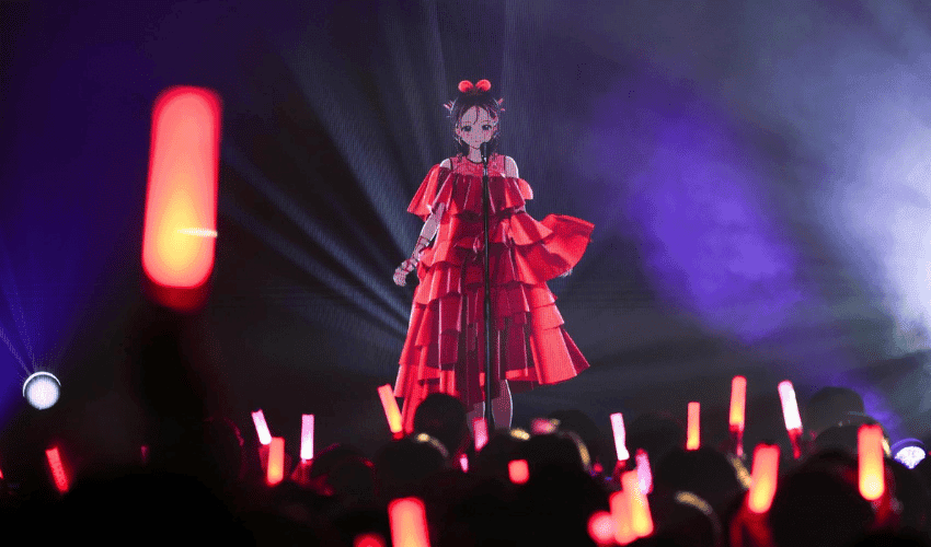 A diferença é que a artista nunca esteve fisicamente no palco. Trata-se de um avatar em estilo anime — classificado como VTuber (virtual YouTuber) — cuja voz e movimentos são executados por profissionais reais nos bastidores.